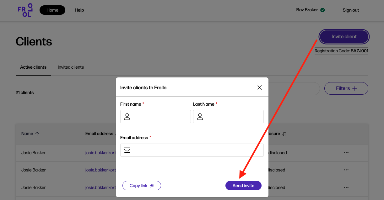 Option 3. Send an invitation email from Frollo for Brokers