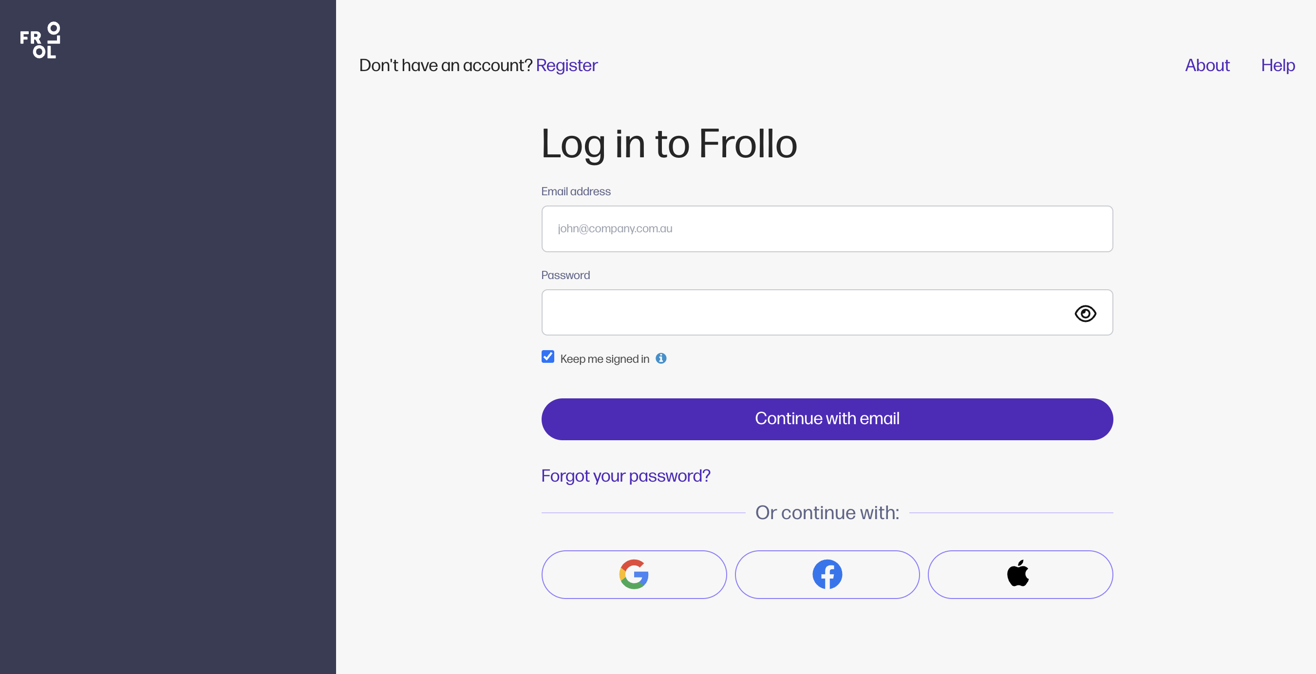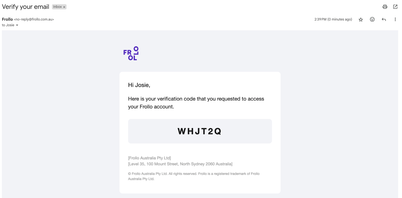 Create your Frollo account Review the Privacy Policy and Terms of Service, then enter your name, email address and create a password to continue. You will need to verify your email address by entering the code emailed, or recovery code. Tip: Alternatively, you can login using your Gmail, Facebook or AppleID. |