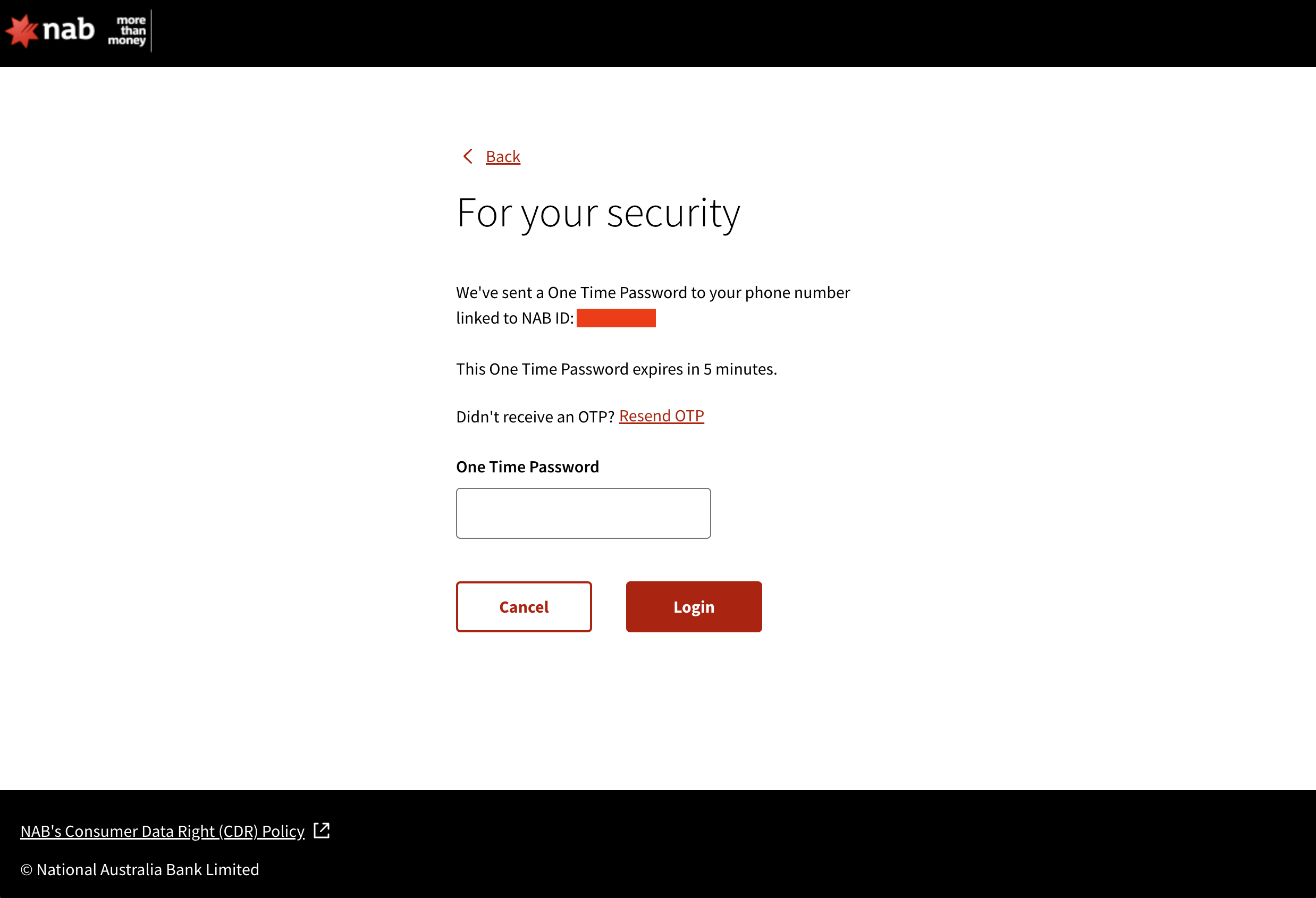 Bank connection By selecting Yes, continue to bank - you will be directed to your bank's CDR-specific site. Your bank will provide you with a One-Time Passcode (OTP) commonly via SMS or your Banking App. Tip: You may need to open you Banking App to see the notification.