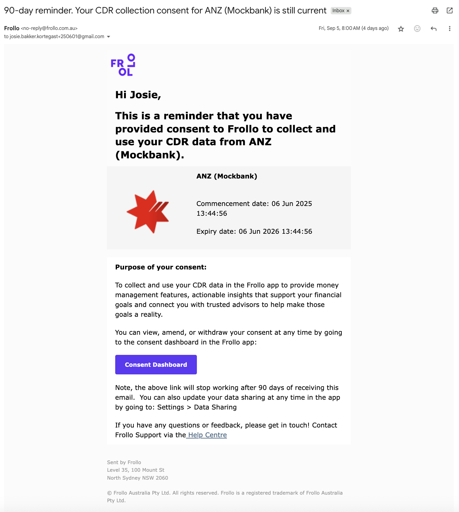 Example Frollo collection email from Frollo: Example Mortgage Broker disclosure email from Frollo: Example Bank data sharing advice email: Example 90-day consent reminder email from Frollo: |