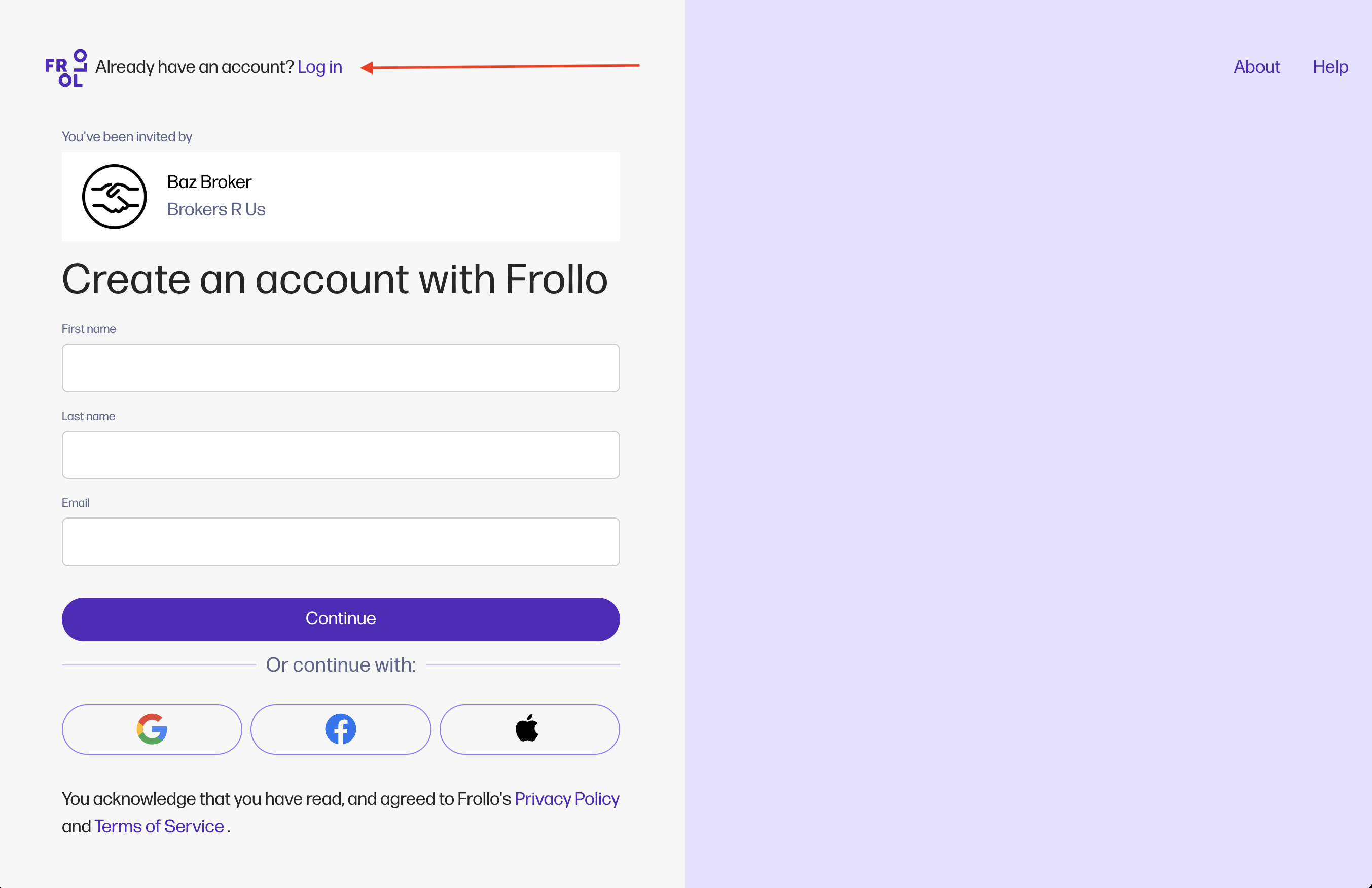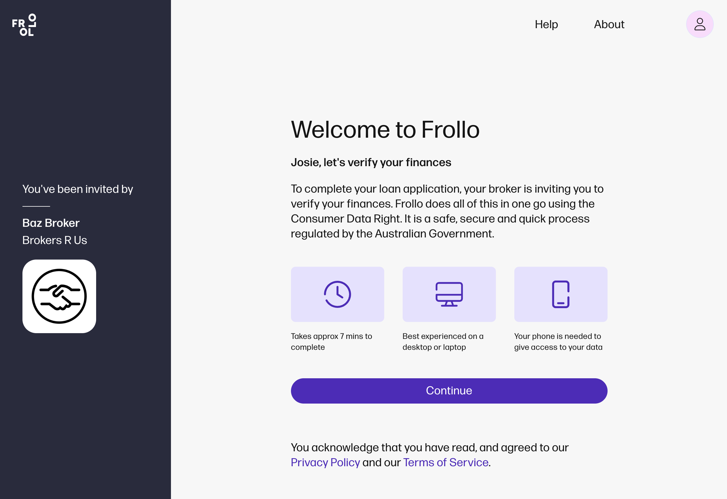 Get started Your mortgage broker has 3 ways to invite you to use Frollo: Option 1. The may ask you to share your data with them from your Frollo app or Option 2. They may provide you with their unique link (URL) or Option 3. They may email an invite to you.
