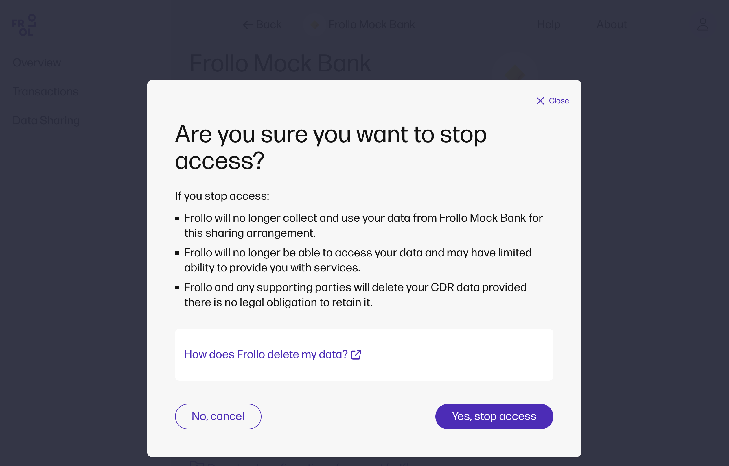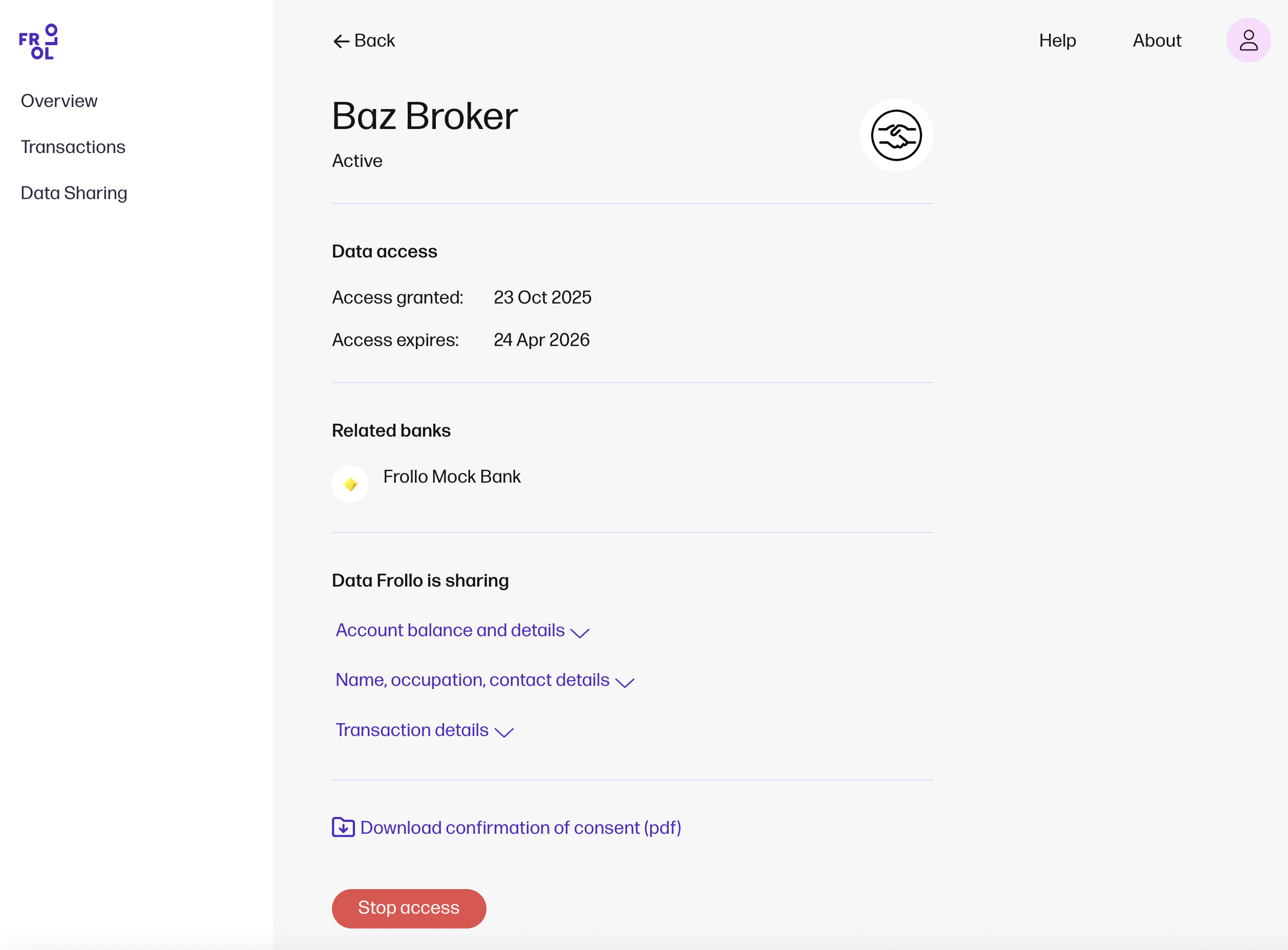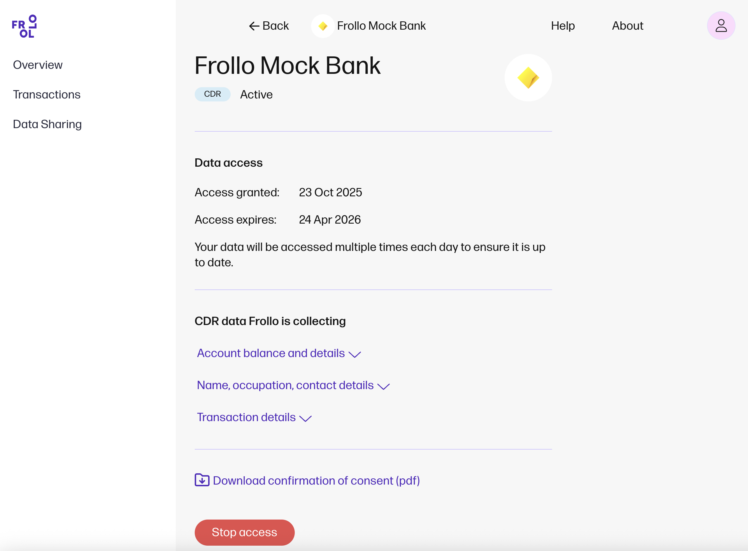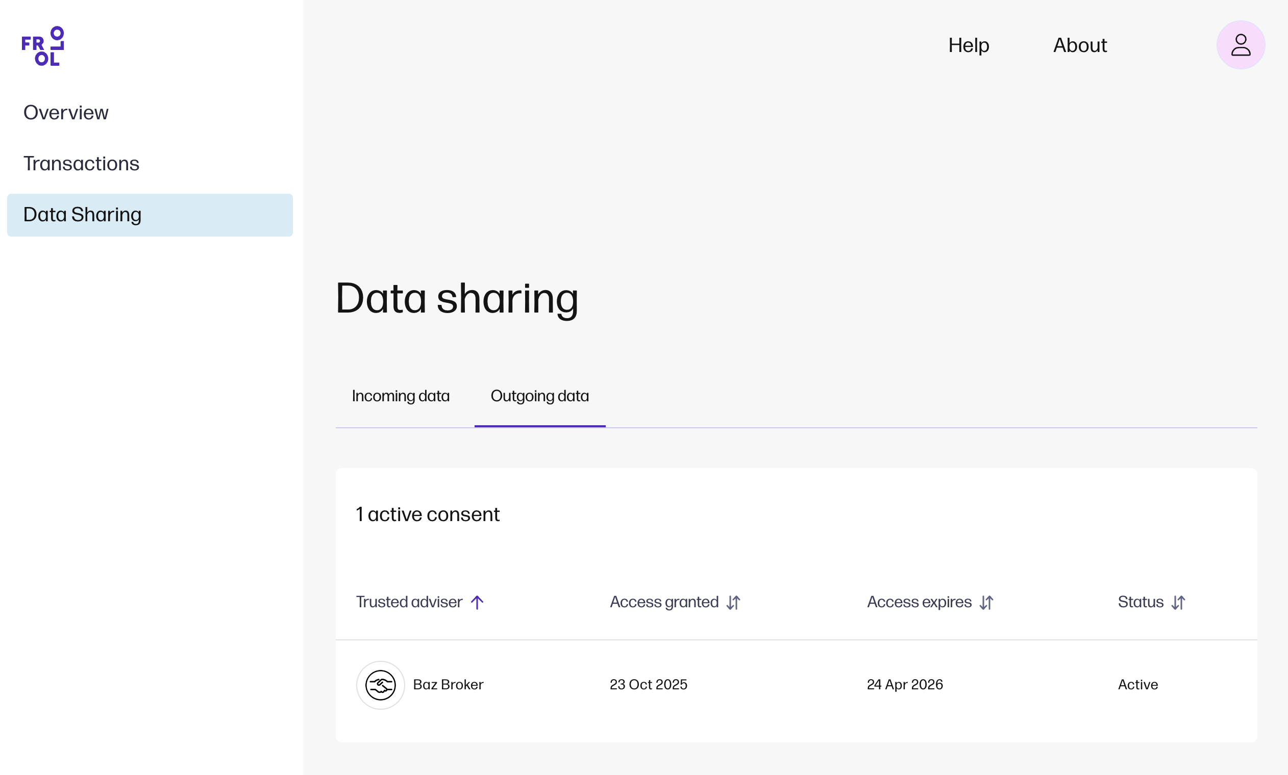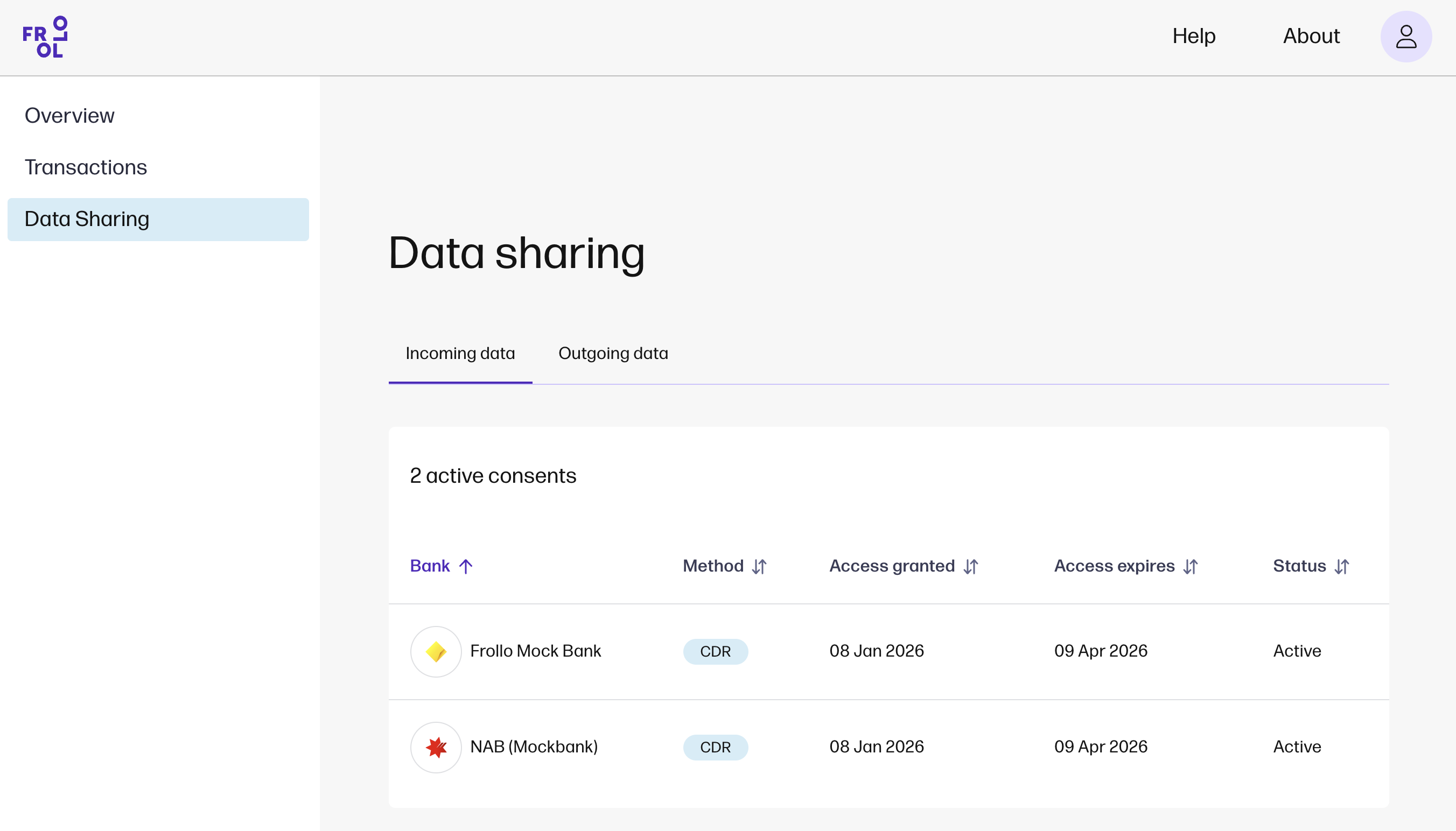 Consent management Manage your consent via your Data sharing dashboard. In the Incoming data tab, you can view the consents for accounts that are connected to Frollo. The Outgoing data tab shows the consents for accounts that you’ve shared with your mortgage broker. Incoming and outgoing data consent can be withdrawn at any time by selecting the row. Also, use Help at any time to access FAQs or contact our Support Team. |
