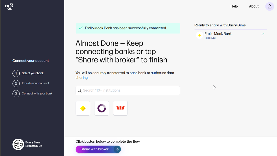 Connect more banks You can repeat the process to add more banks. If a failure occurs, you can retry or contact our Support Team via the Help Centre Once done, select: Share with broker. |