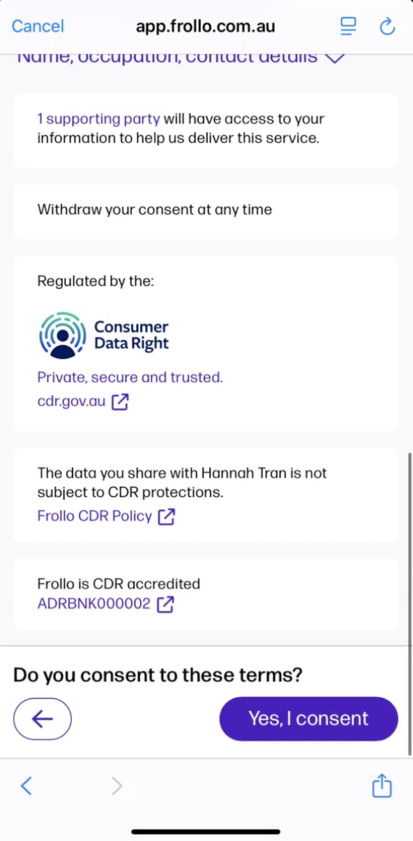 Within the Frollo app, you can visit Settings > Data Sharing > Disclosed data Select Find a mortgage broker |