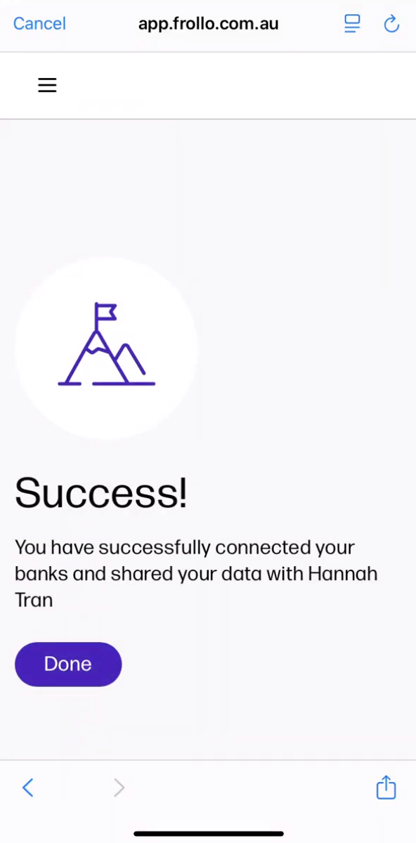 That's it, you're done! Your Mortgage Broker will receive an email to let them know that your data and documents are available for them to securely retrieve via Frollo for Brokers. |