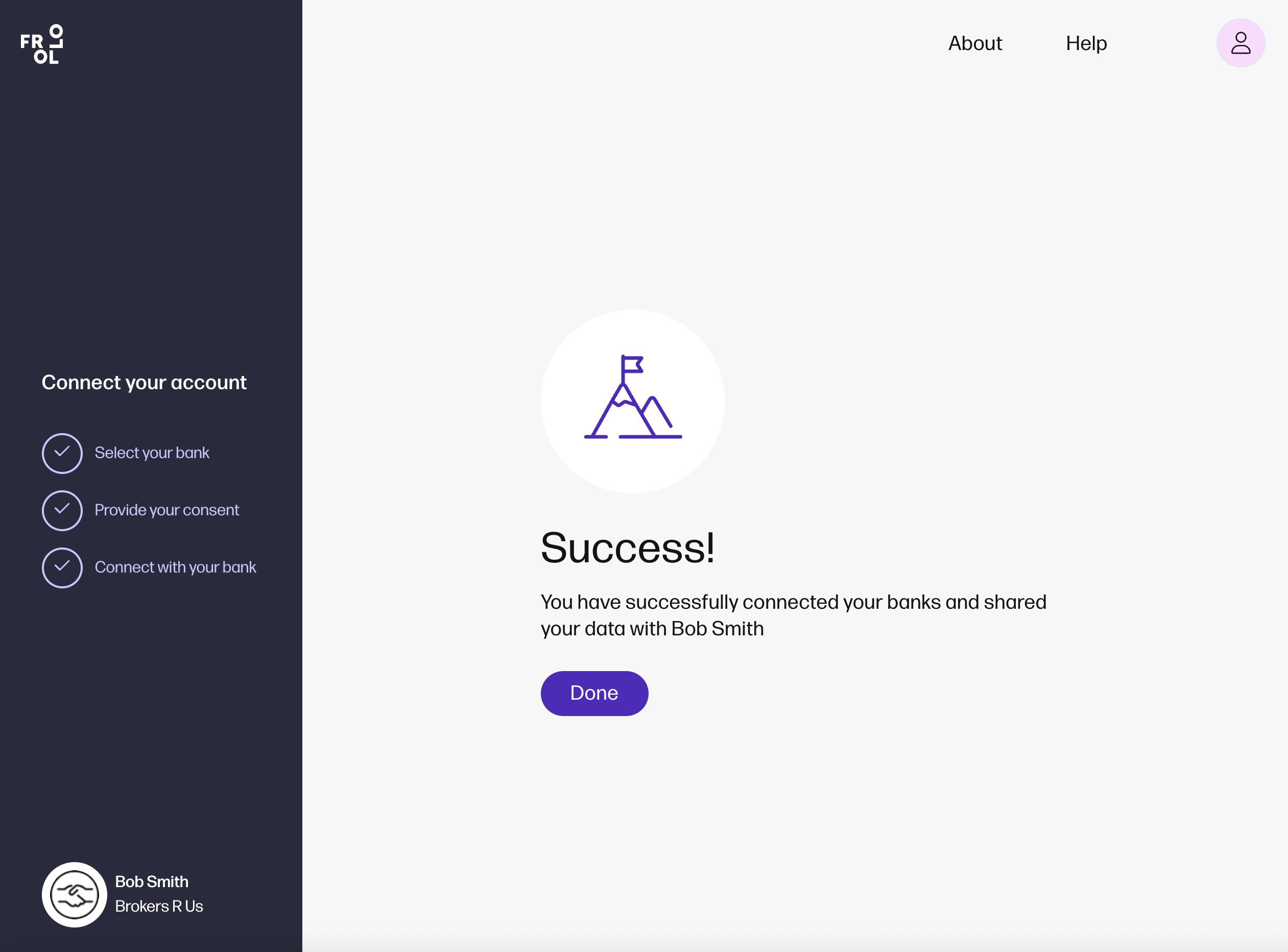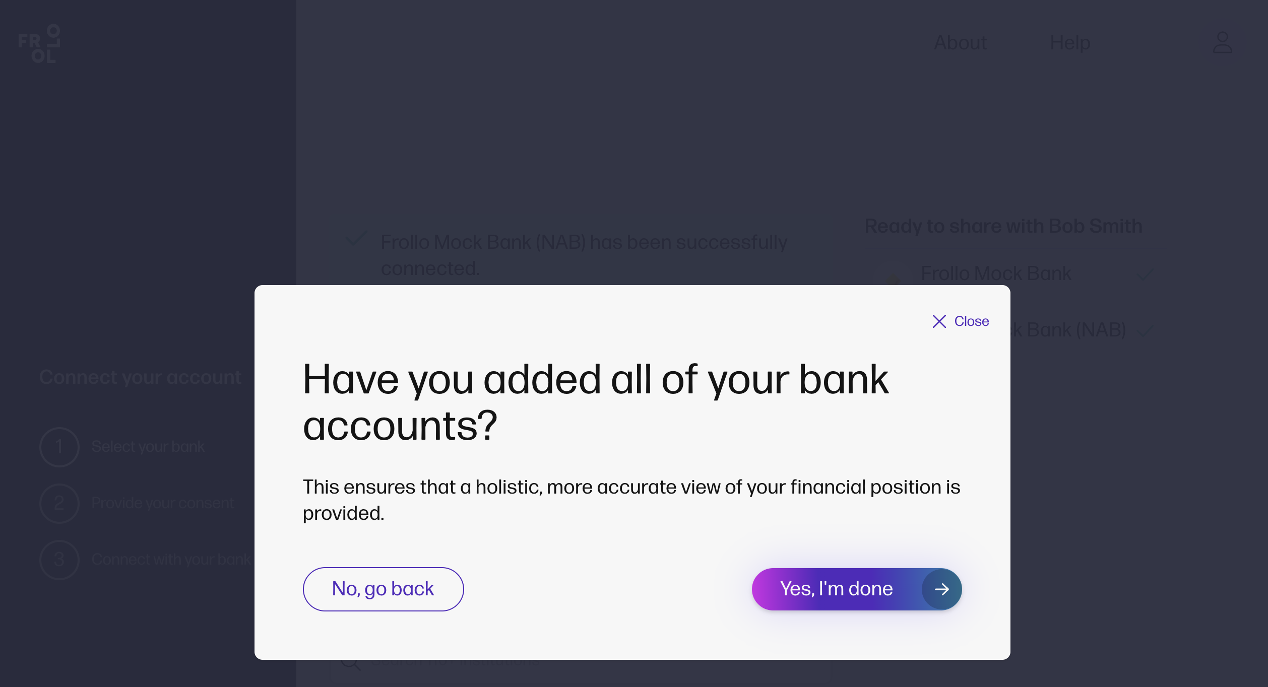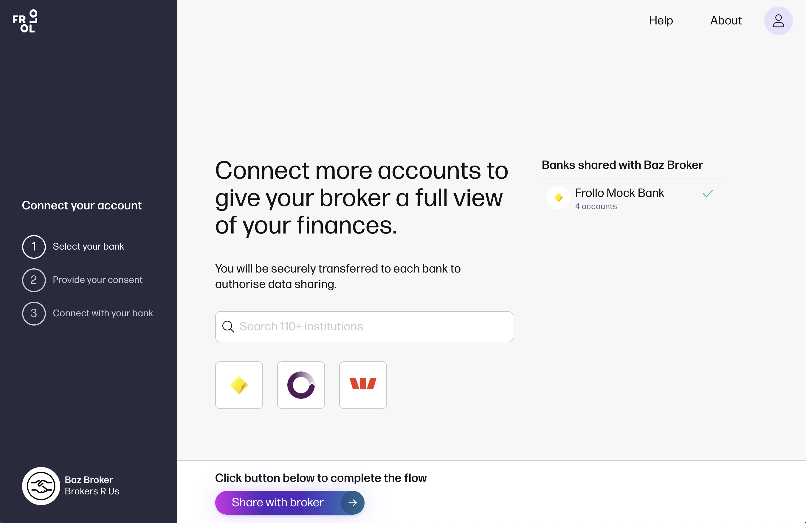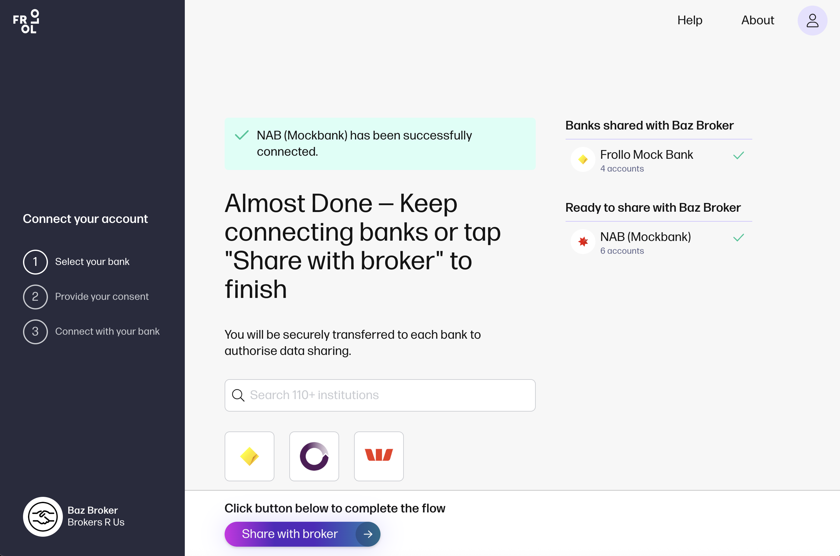 Connect more banks You can repeat the process to add more banks. If a failure occurs, you can retry or contact our Support Team via the Help Centre Once done, select: Share with broker. |