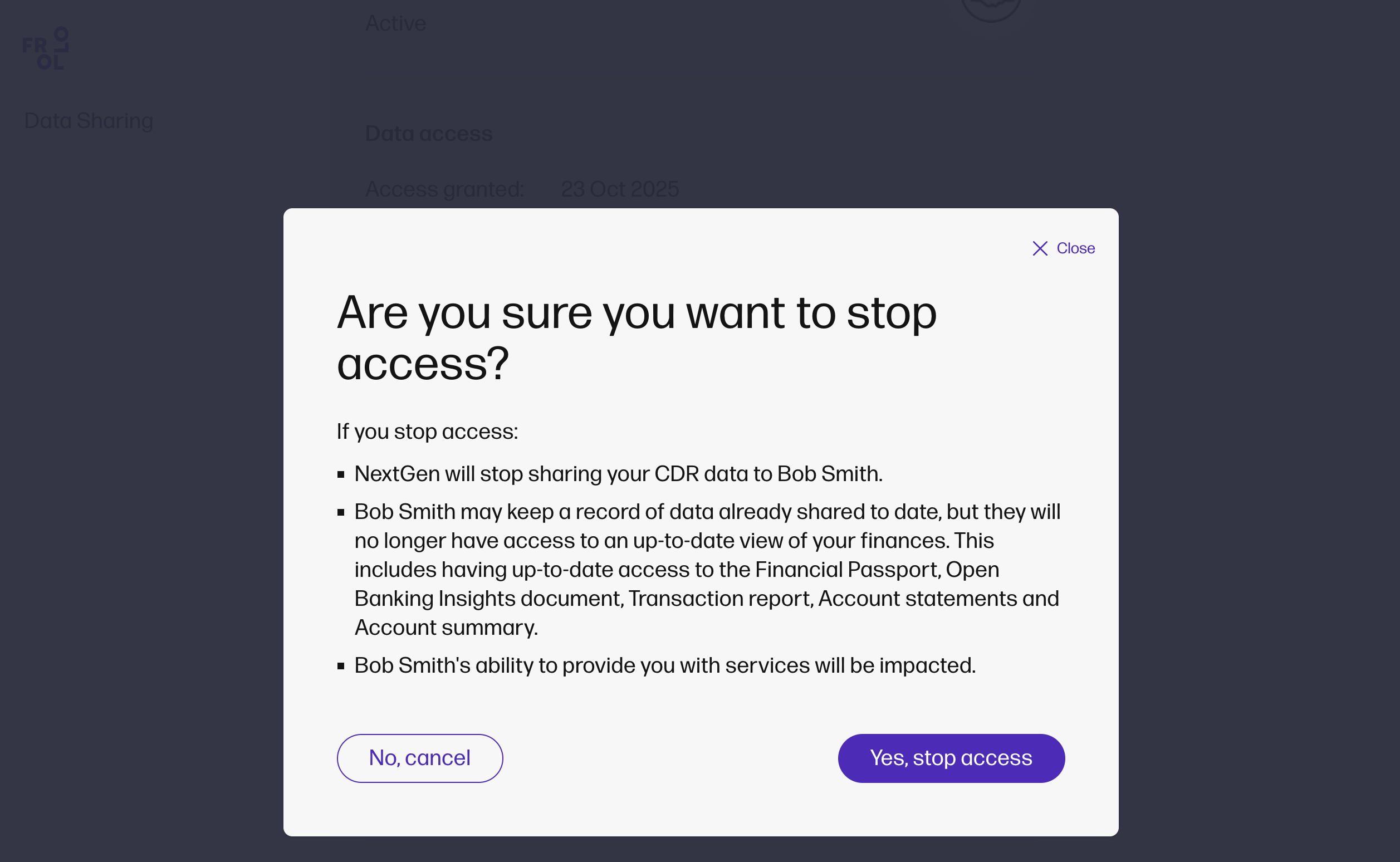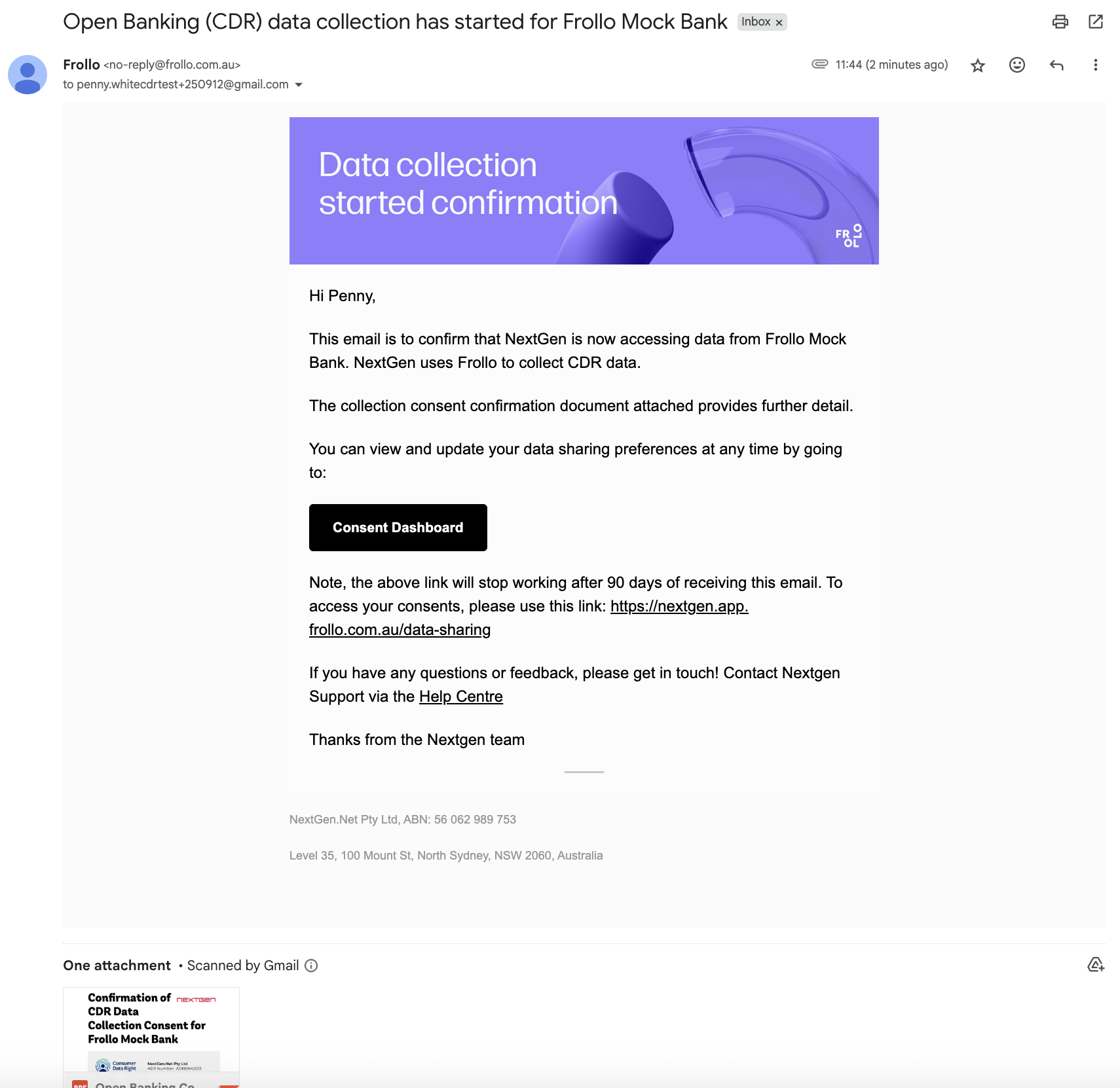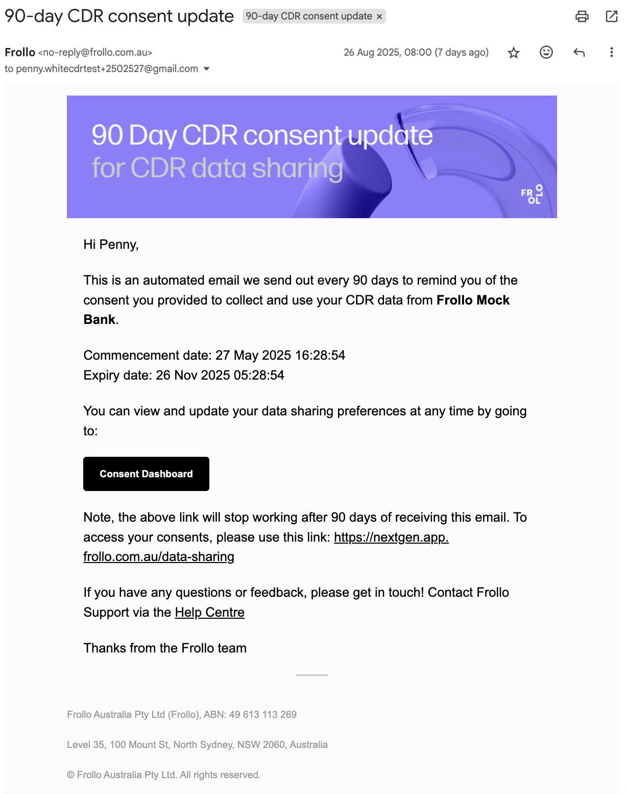Example NextGen collection email from Frollo: Example Mortgage Broker disclosure email from Frollo: Example Bank data sharing advice email: Example NextGen 90-day consent reminder email from Frollo: |