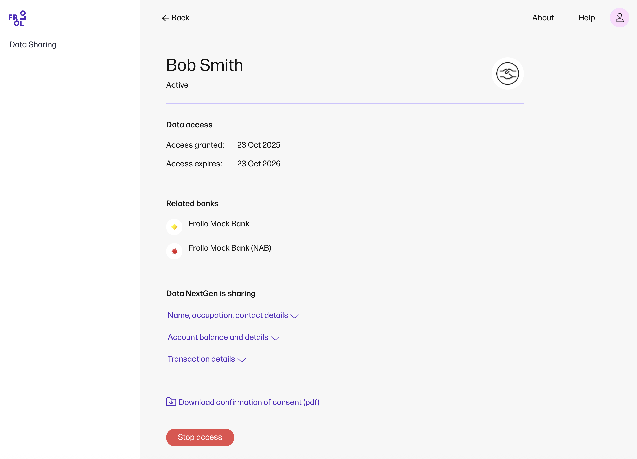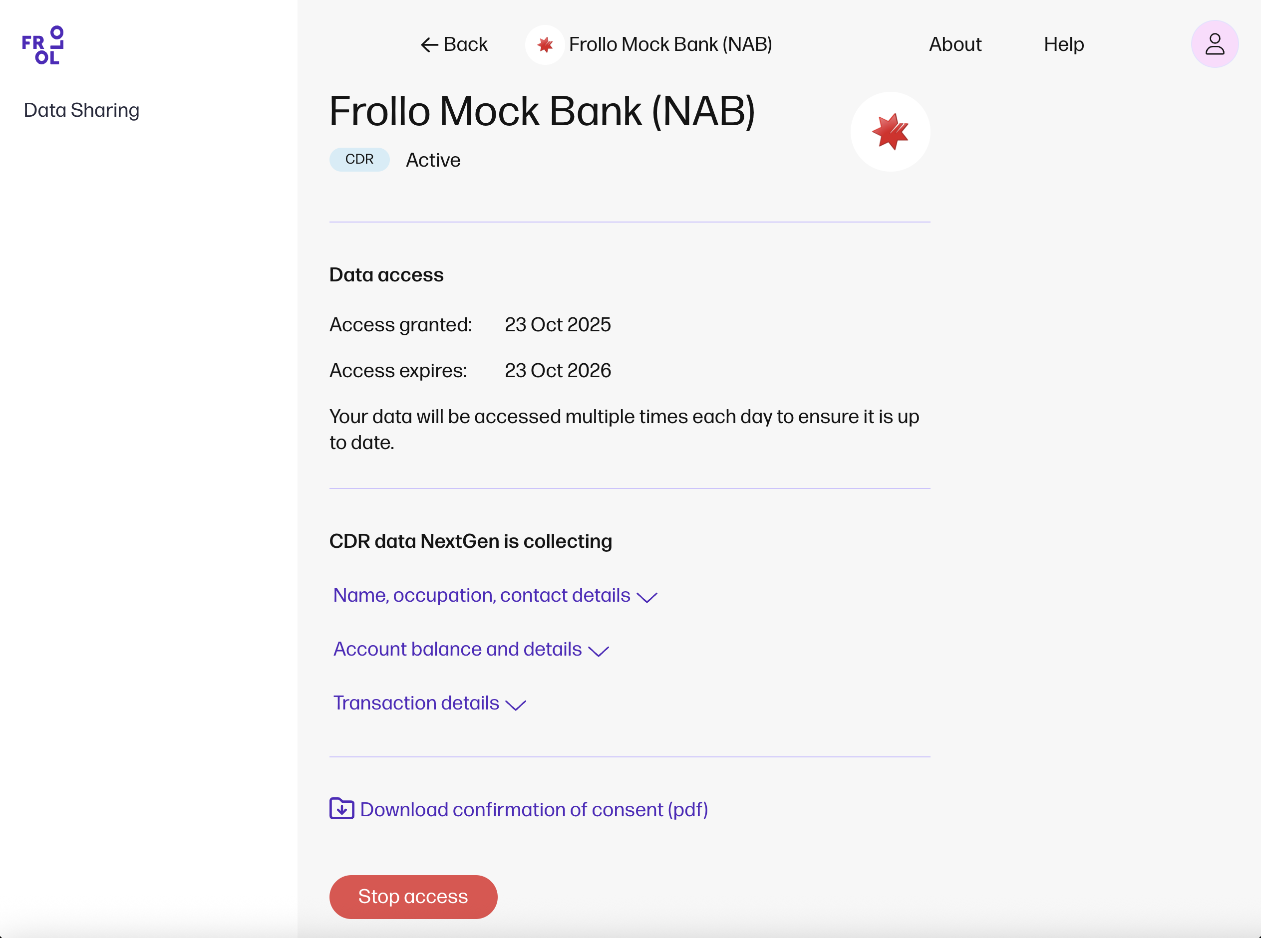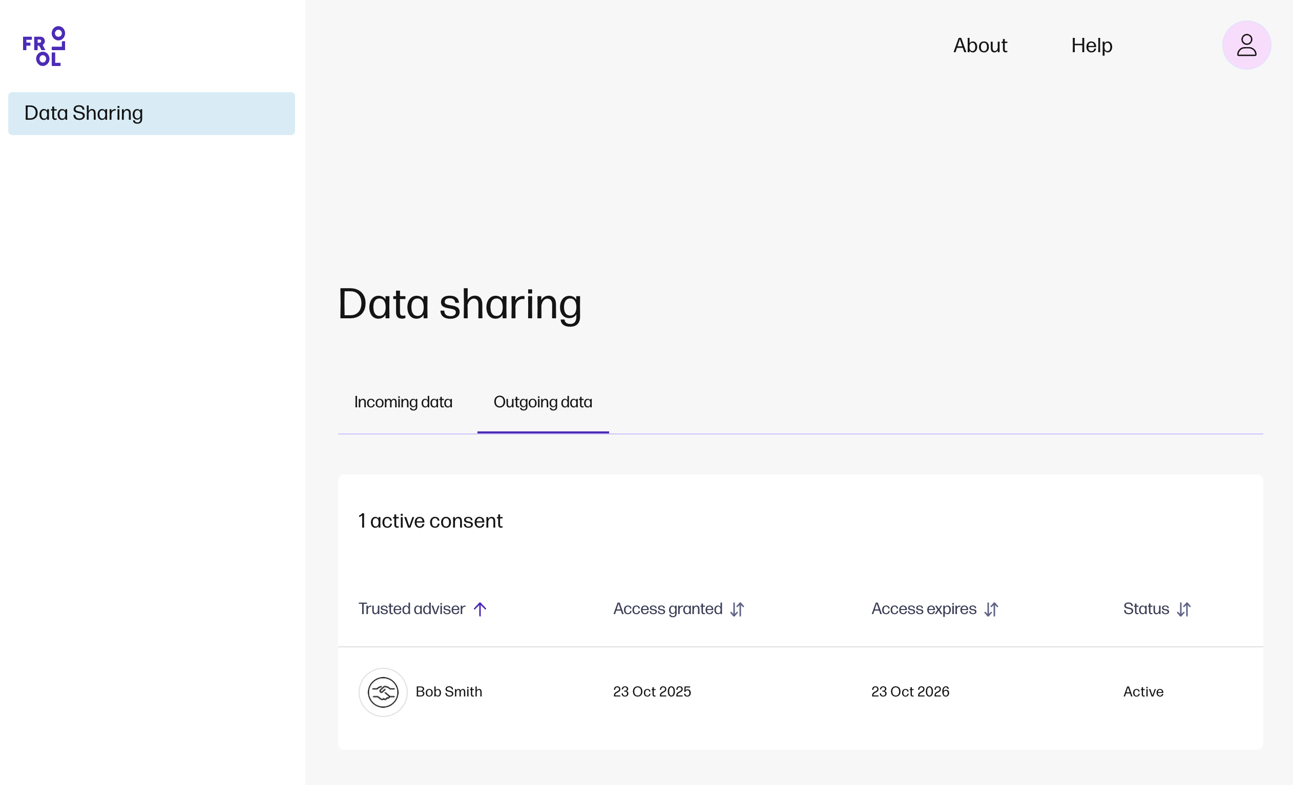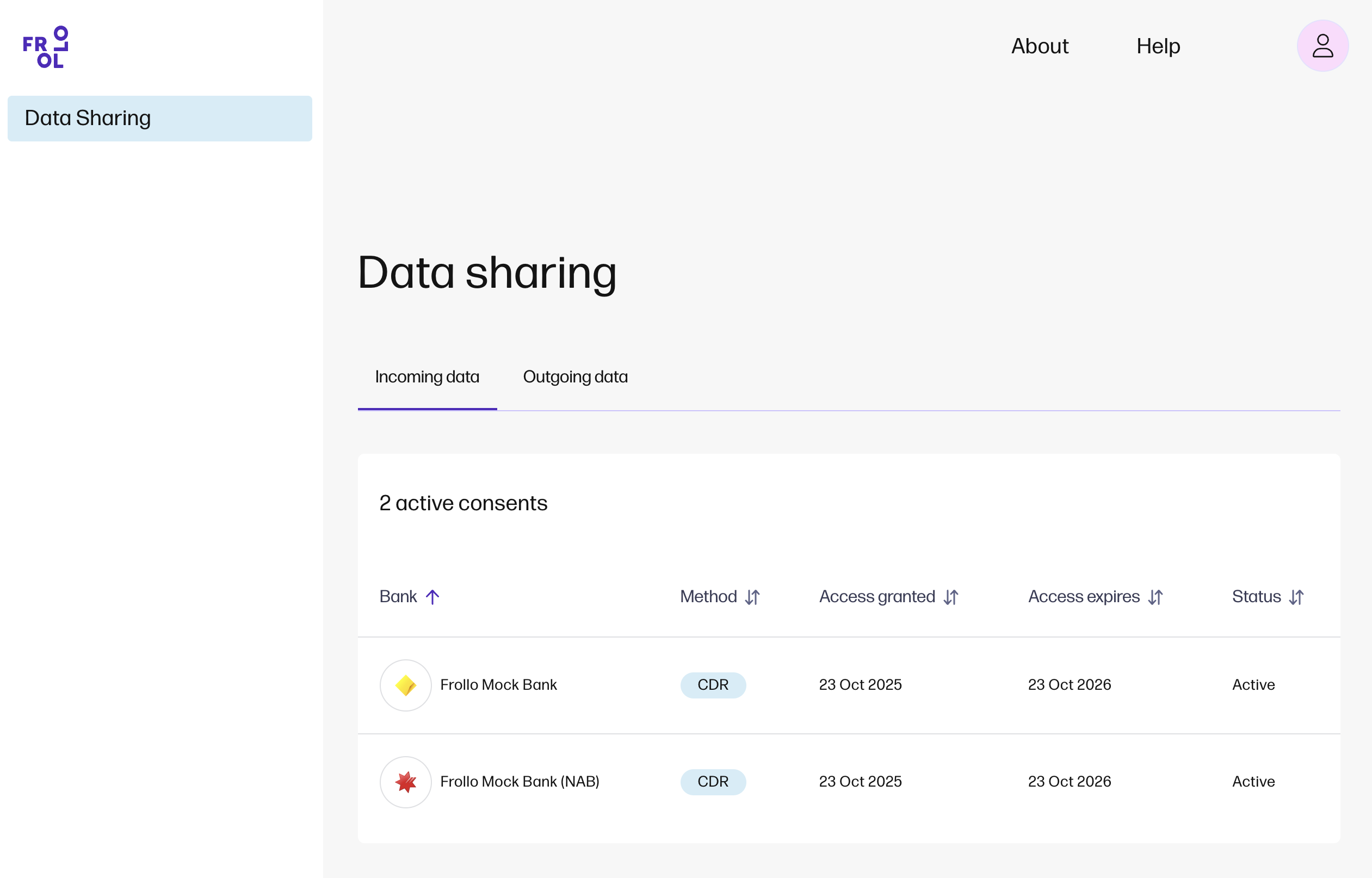 Consent management Manage your consent via your Data sharing dashboard. In the Incoming data tab, you can view the consents for accounts that are connected to Frollo. The Outgoing data tab shows the consents for accounts that you’ve shared with your mortgage broker. Incoming and outgoing data consent can be withdrawn at any time by selecting the row. Also, use Help at any time to access FAQs or contact our Support Team. |