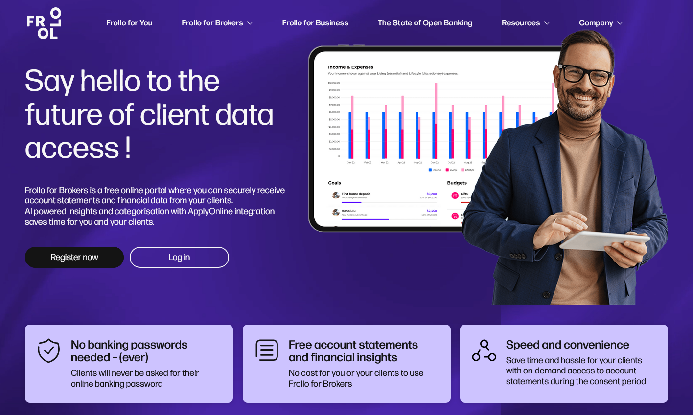 Frollo for Brokers is a free online portal where authorised Mortgage Brokers can securely receive and refresh financial information from their clients using Open Banking, as part of their fact-find process in preparation for loan applications.