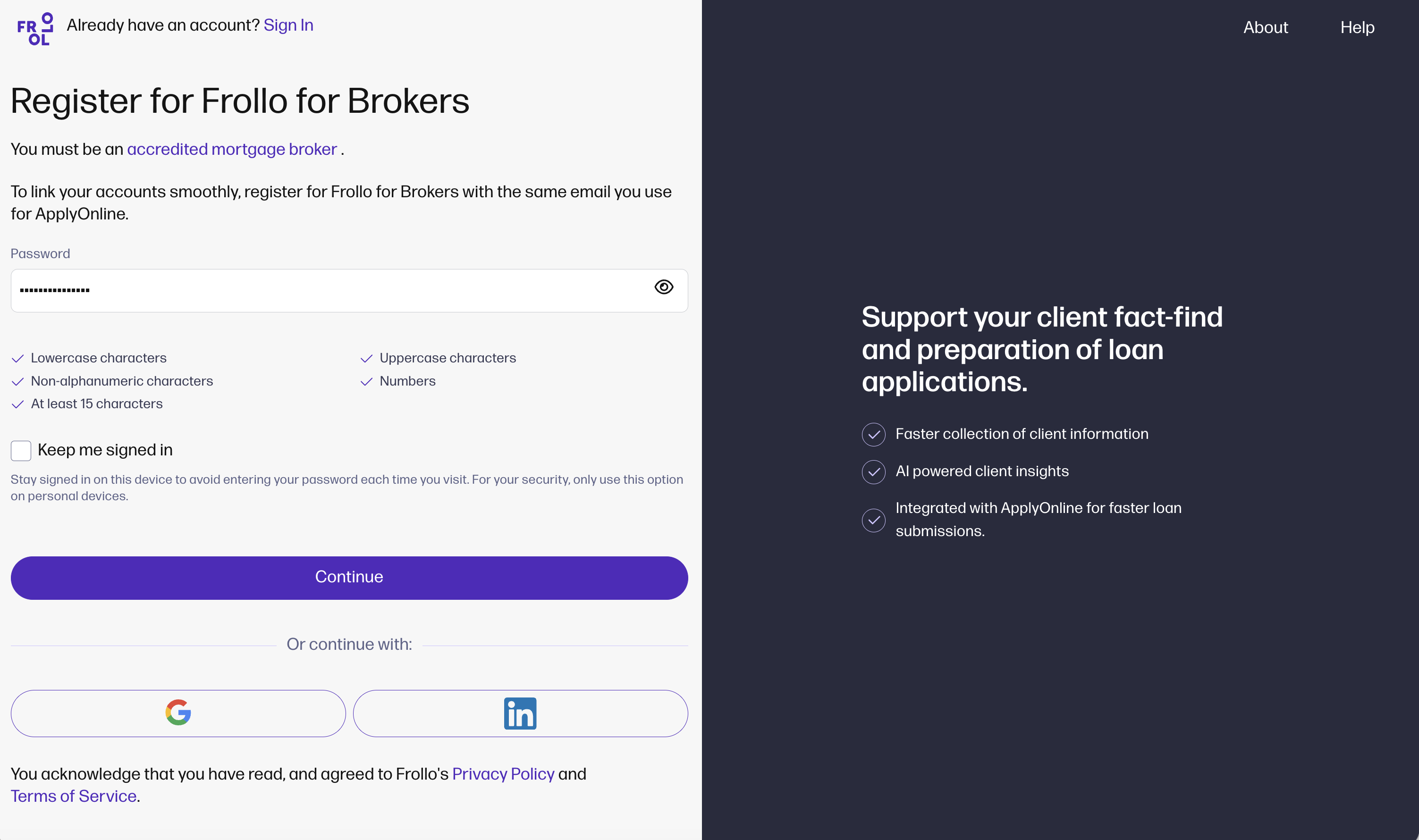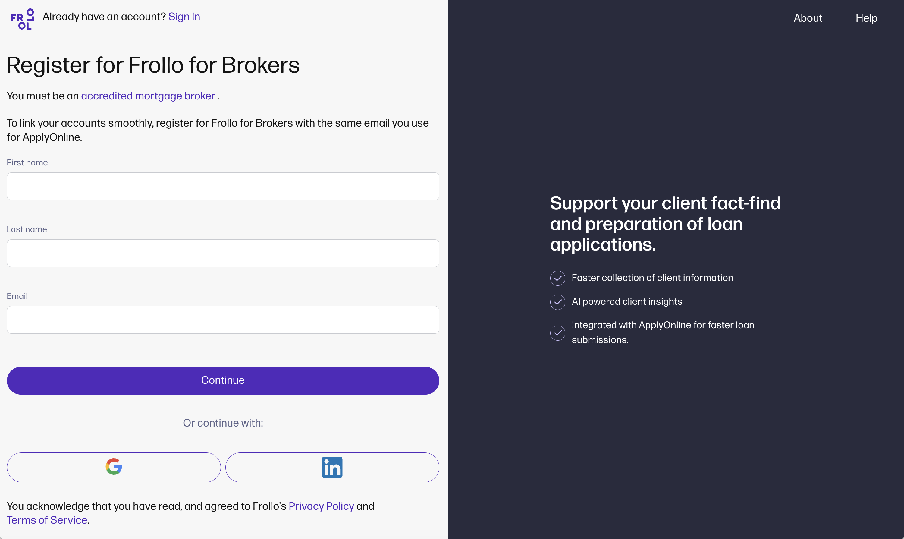 Register for Frollo for Brokers. Read and agree to Frollo's Privacy Policy and Terms of Service Then, register using one of two options, either: 1. Enter your name and email. Then create a password that meets our security standards, and select Continue or 2. Continue by logging in using your Gmail or LinkedIn account.