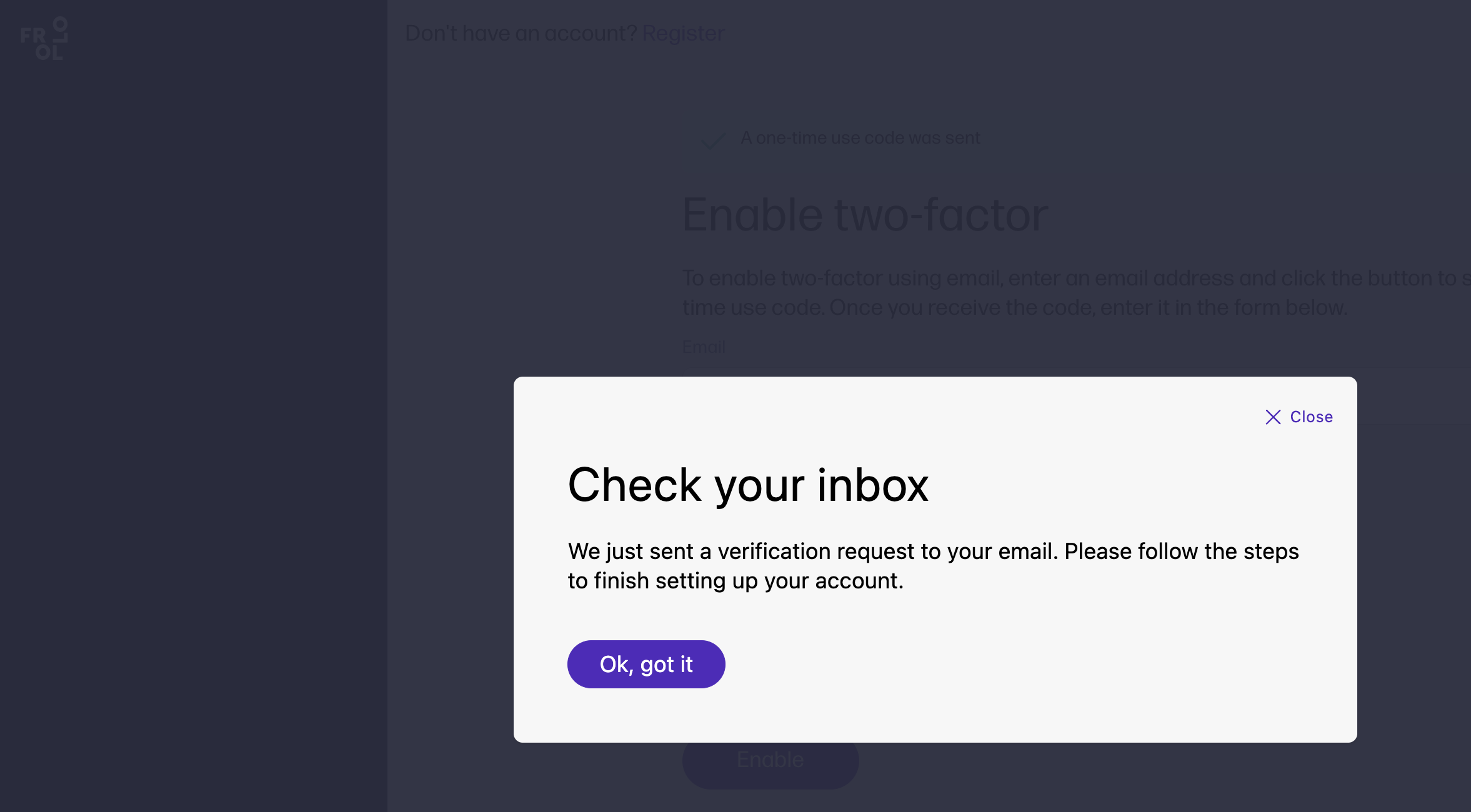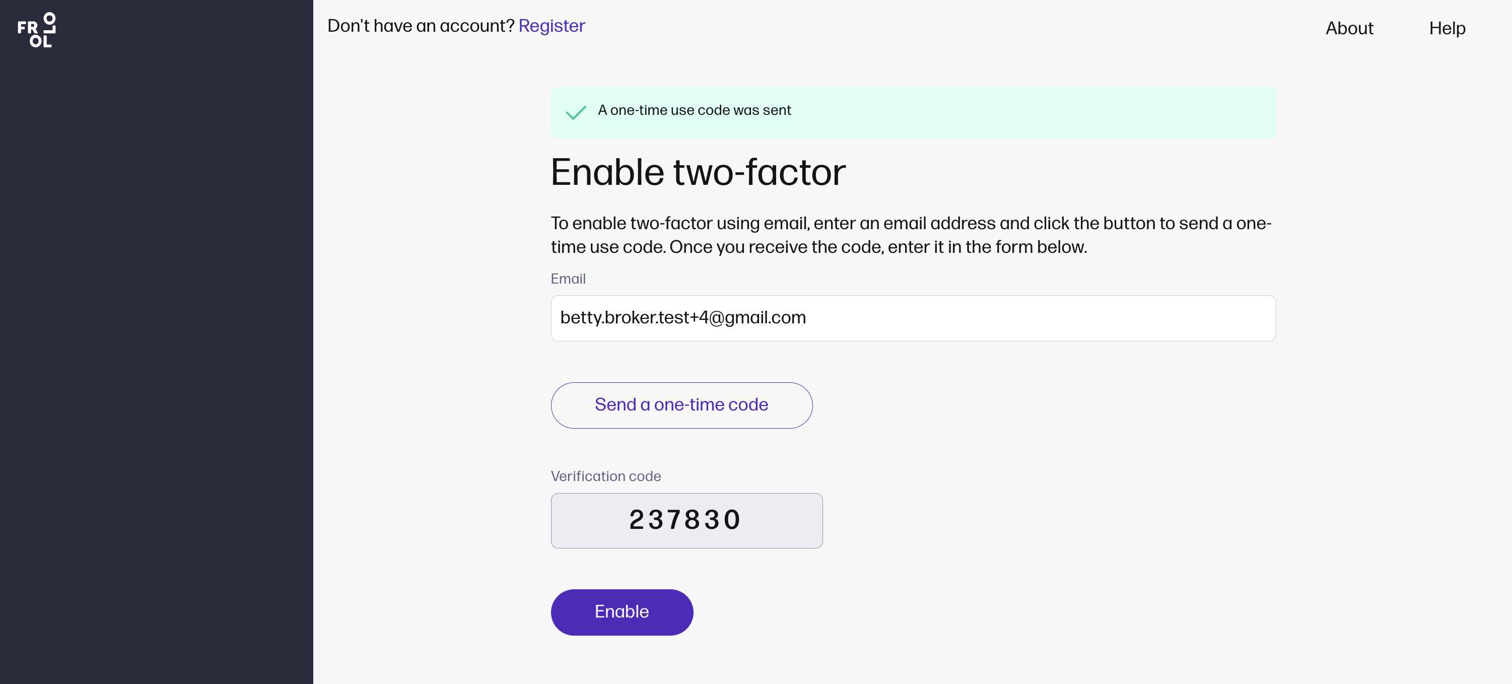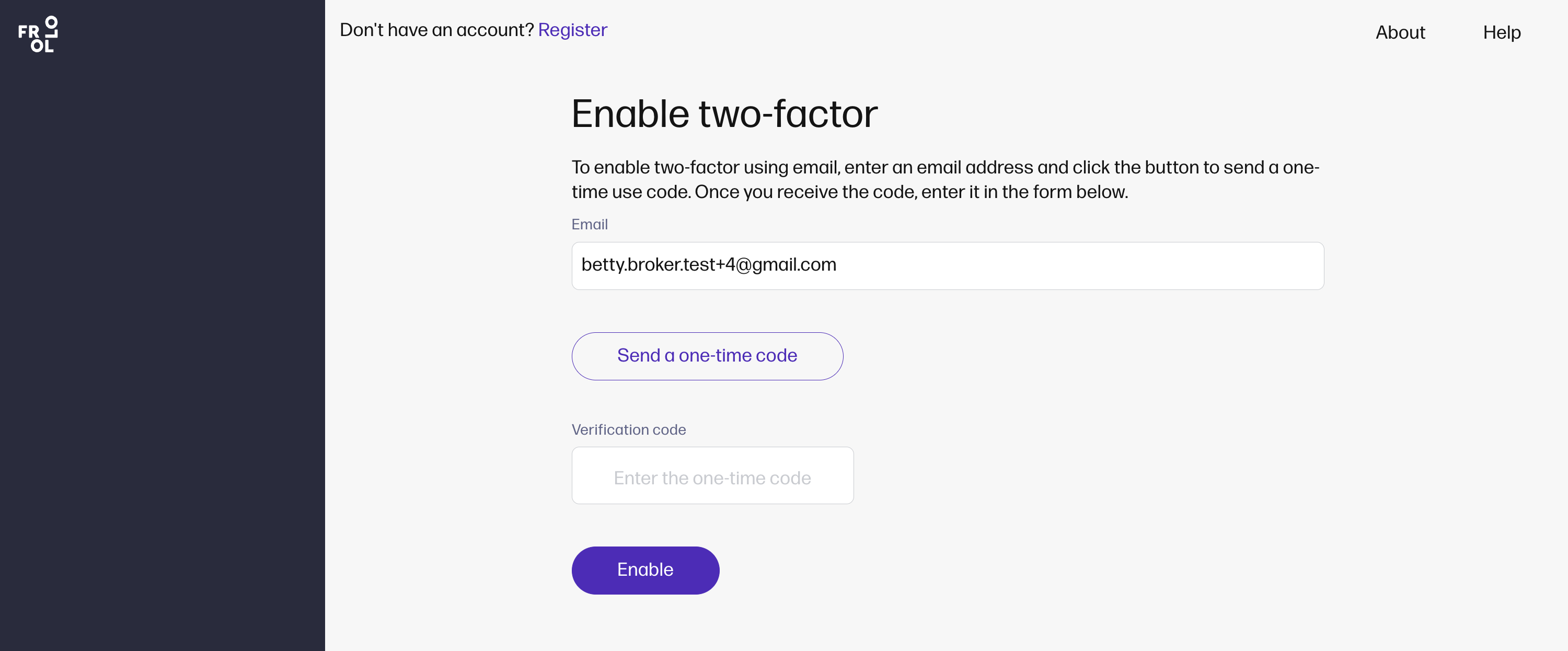 Enable two-factor authentication. To enable two-factor using email, enter an email address and click the button to send a one-time use code.