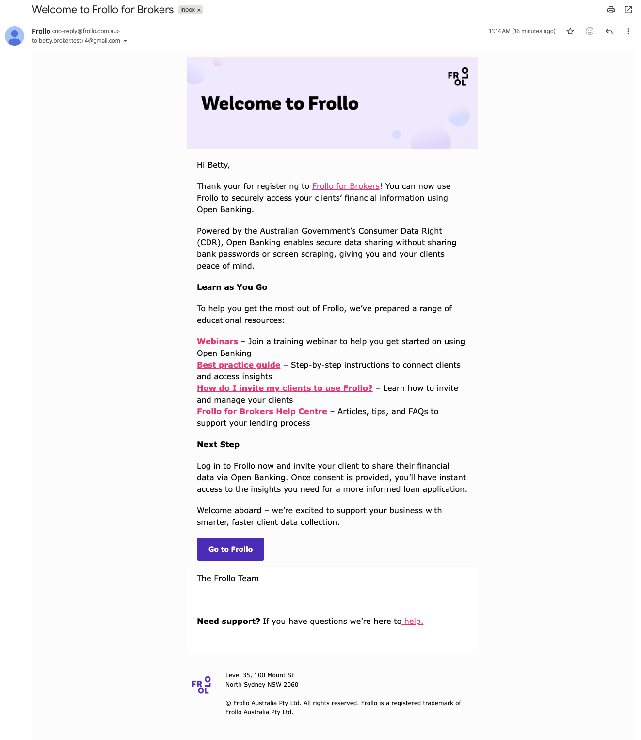 Welcome to Frollo! Thank you for registering for Frollo for Brokers! You can now use Frollo to securely access your clients' financial information using Open Banking. Powered by the Australian Government's Consumer Data Right (CDR), Open Banking enables secure data sharing without sharing bank passwords or screen scraping, you and your clients peace of mind. Learn as You Go To help you get the most out of Frollo, we've prepared a range of educational resources: