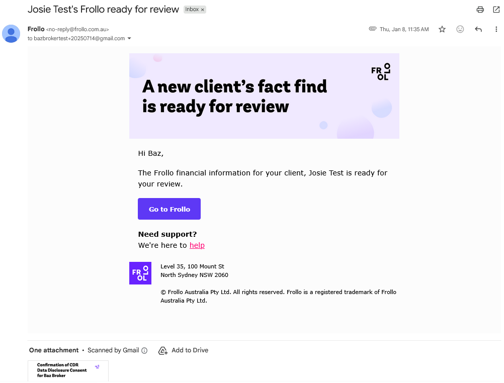 Yes, you will receive an email to let you know that your client's data and documents are available for you to securely retrieve from Frollo for Brokers.